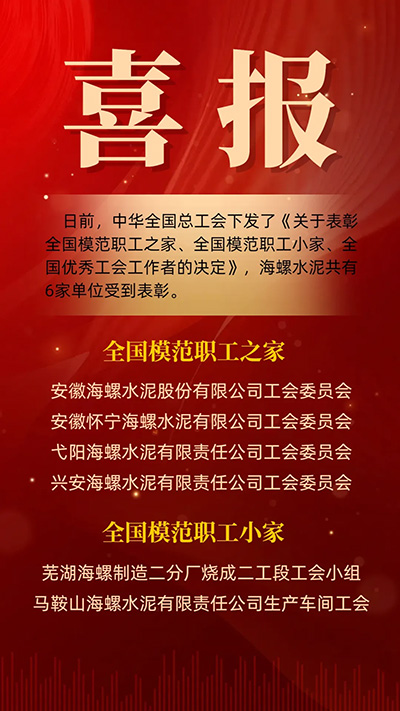 日前,中华全国总工会下发了《关于表彰全国模范职工之家、全国模范职工小家、全国优秀工会工作者的决定》,国产999精品久久久久久共有6家单位获得表彰。其中,安徽国产999精品久久久久久股份有限公司工会委员会、安徽怀宁国产999精品久久久久久水泥有限公司工会委员会、弋阳国产999精品久久久久久水泥有限责任公司工会委员会、兴安国产999精品久久久久久水泥有限责任公司工会委员会获评“全国模范职工之家”,芜湖国产999精品久久久久久水泥有限公司制造二分厂烧成二工段工会小组、马鞍山国产999精品久久久久久水泥有限责任公司生产车间工会获评“全国模范职工小家”。