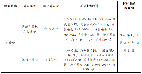 2.招标方式:采取公开招标方式,按矿渣粉质量指标要求确定区域矿渣粉中标的供货入围渠道。