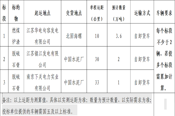 1.投标单位必须提供真实、合法有效的、具备公路运输的公司资质,投标时提供“三证合一”的营业执照副本、道路运输经营许可证副本、拟投入运输车辆的机动车登记证或行驶证复印件、车辆交强险保单、机动车第三