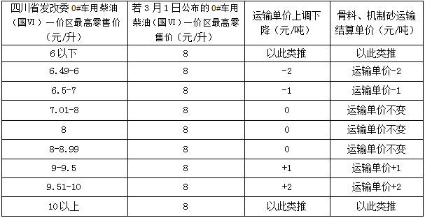 2.本次招标运输费用为运输到厂卸货所发生的一切费用。运价在合同期内执行油价与运价联动机制的运输招标:以四川省发改委2024年3月1日公布的0#车用柴油(国Ⅵ)一价区最高零售价***元/升作为油价联动基准价,如在合同期内四川省发改委公布0#车用柴油(国Ⅵ)一价区最高零售价格(以下简称:公布最新油价)涨跌幅度超过1元/升,启动油价联动,调整日期与四川省发改委公布油价调整日期同步。具体方式为:①若合同期内公布最新油价较基准价上调或下降幅度小于等于1元/L,则运输费用不作调整;②若合同期内公布最新油价较基准价涨跌幅度大于1元/L,小于等于1.5元/L,则运输费用在合同价基础上上调或下降1元/吨;③若合同期内公布最新油价较基准价涨跌幅度大于1.5元/L,小于等于2元/L,则运输费用在合同价基础上上调或下降2元/吨,以次类推。