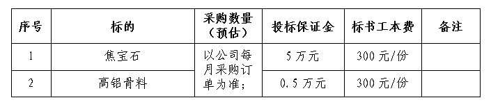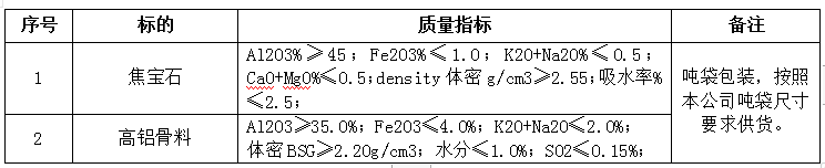 根据本公司自2024年2季度耐火砖生产计划。为确保焦宝石和高铝骨料及时采购到货。现本着“公开、公平、公正、透明”的原则进行公开招标,诚邀经营资质能力较好、保供和服务能力较强的生产型或贸易型企业参加投标。现就招标相关事项请示如下: