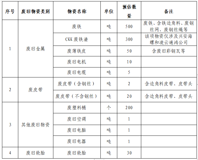 1.包含但不限于以上废旧物资类别,同时数量仅为预估数量,具体数量以实际过磅或点数回收数量为准。