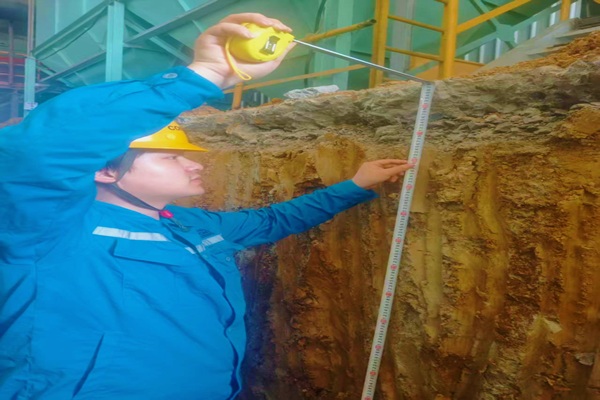 在水泥厂自动装车车道地基破除的周边,“TA”用心测量着每个基础钢筋的距离,这处地基挖的孔洞明显向南偏了20公分,那里的预埋件明显倾斜不在水平面,“TA”指着孔洞以及前面水平仪上的刻度说,“现在不调整,等混凝土浇筑后地基不牢固或者偏移过大就是大问题”。