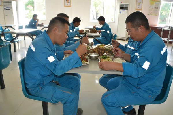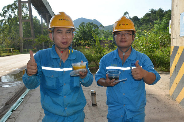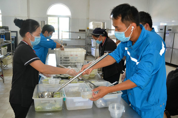 采摘下来的新鲜龙眼和柠檬很快被送往食堂,食堂师傅们忙碌起来,将饱满多汁的龙眼剥壳取肉,柠檬切片榨汁,熬制当地特产凉粉草。龙眼果肉与柠檬片在清冽矿泉水中舒展,释放出清甜与微酸的完美协奏;凉粉草熬制的“北流凉粉”,凝冻如墨玉,清凉解暑。天然原料经巧手化作两大消暑佳品——晶莹剔透的龙眼柠檬水与地道爽滑的“北流凉粉”。冰镇后的饮品带着果香与凉意,被后勤人员分装成杯,及时送到各岗位。